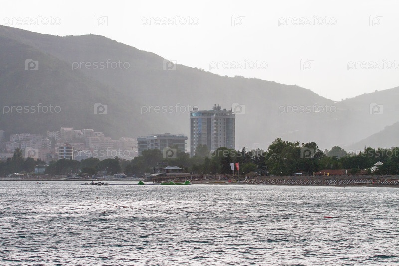 Вид с моря на курортный город Будва, Черногория летом