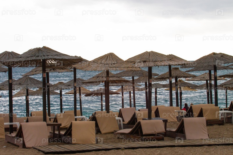 Шезлонги и зонтики на пляже Кипра летом