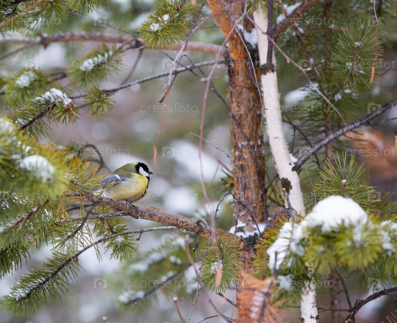 Синица на ветке сосны в зимнем лесу в Ноябрьске на морозе