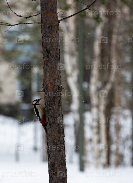 Дятел на ветке сосны в парке Ноябрьска зимой