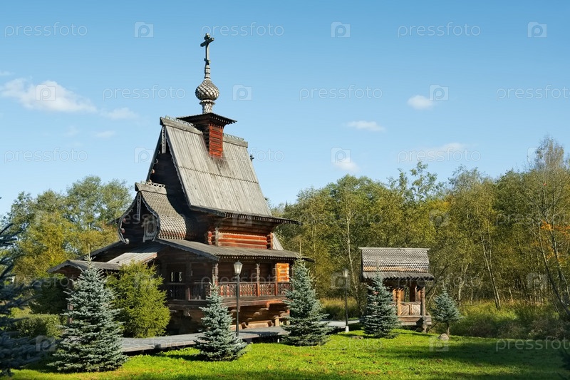 Россия, Московская область. Сентябрь 27, 2023. Деревянная церковь Сорока мучеников Севастийских в историческом комплексе Гремячий Ключ