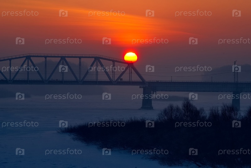 Новокузнецк, Россия. Юг Западной Сибири. Восходящее солнце над железнодорожным мостом морозным январским утром