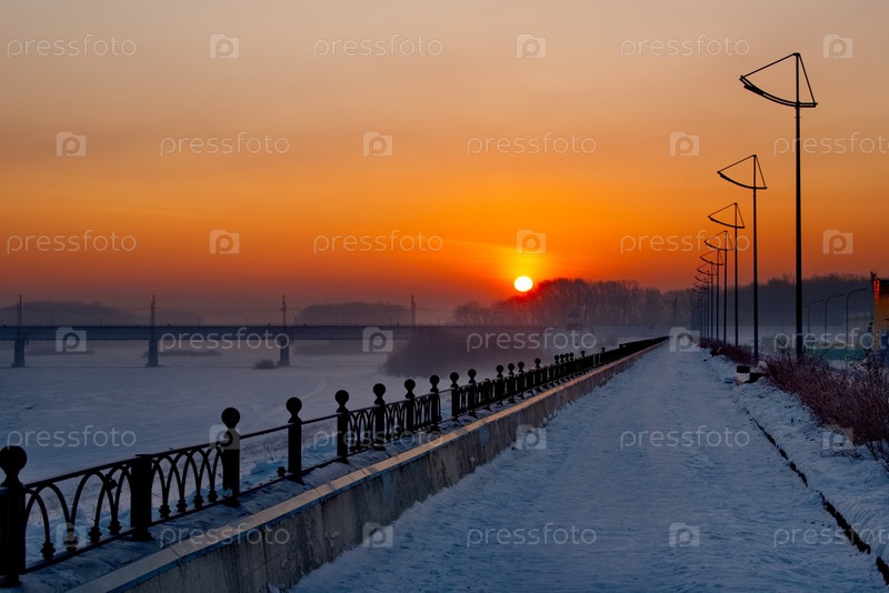 Новокузнецк, Россия. Юг Западной Сибири. Восходящее солнце над железнодорожным мостом морозным январским утром