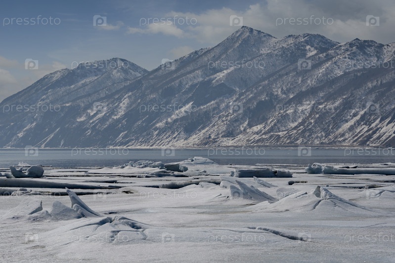 Россия. Дальний Восток. Весенний вид на лед бухты Тихая Тихоокеанского побережья острова Сахалин