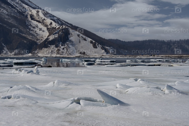 Россия. Дальний Восток. Весенний вид на лед бухты Тихая Тихоокеанского побережья острова Сахалин