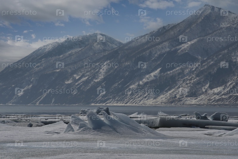 Россия. Дальний Восток. Весенний вид на лед бухты Тихая Тихоокеанского побережья острова Сахалин