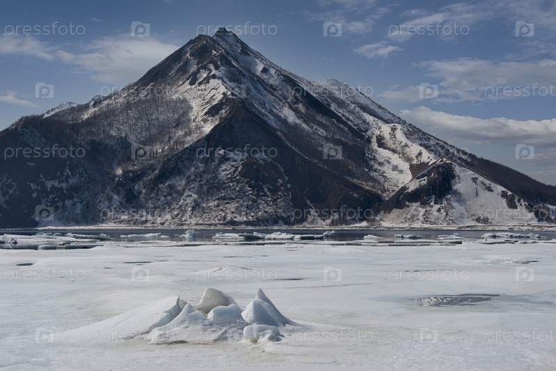 Россия. Дальний Восток. Весенний вид на лед бухты Тихая Тихоокеанского побережья острова Сахалин