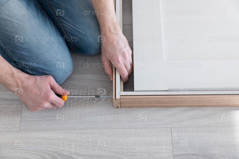 Рабочий затягивает дверную раму винтом. Монтаж и установка межкомнатных дверей
