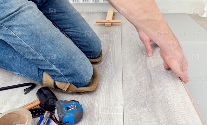 Мужчина укладывает ламинат на пол, соединяя доски встык