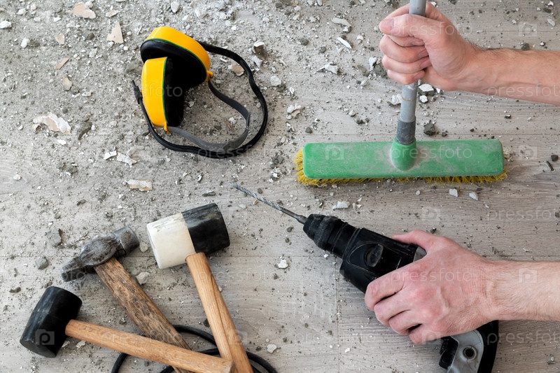 Концепция шумной и грязной работы. Кусочки старой штукатурки на полу