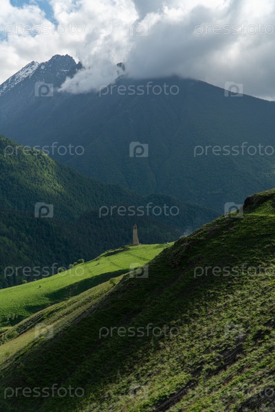 Вид с воздуха на средневековый башенный комплекс в горах Ингушетии, Россия