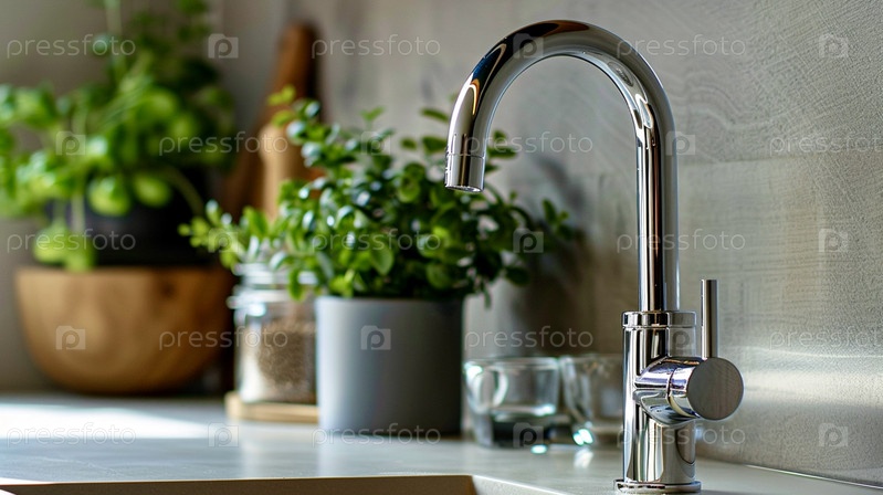 Крупный план современного хромированного смесителя на светлой современной кухне с зеленью в горшке на заднем плане