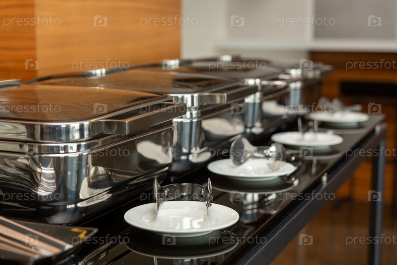 Ряд закрытых блюд "шведский стол" в банкетном зале. Готовая к употреблению жаровня из нержавеющей стали на шведском столе