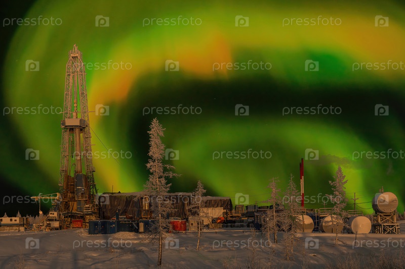 Буровая установка и северный пейзаж нефтегазового месторождения на фоне полярного сияния. Пейзаж с красивым ночным небом зимой в Арктике