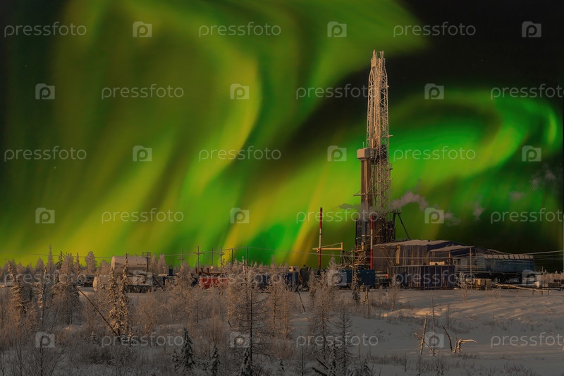Буровая установка и северный пейзаж нефтегазового месторождения на фоне полярного сияния. Пейзаж с красивым ночным небом зимой в Арктике
