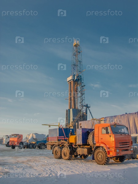 На заднем плане буровая установка на северном нефтегазовом месторождении. На переднем плане – технология тампонажного цементирования обсадной колонны скважины