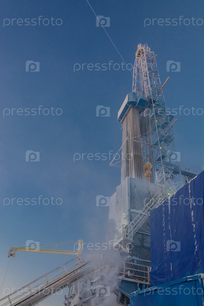 Буровая установка на северном нефтегазовом месторождении. Зимний полярный день. Оборудование и бурильные трубы покрыты снегом