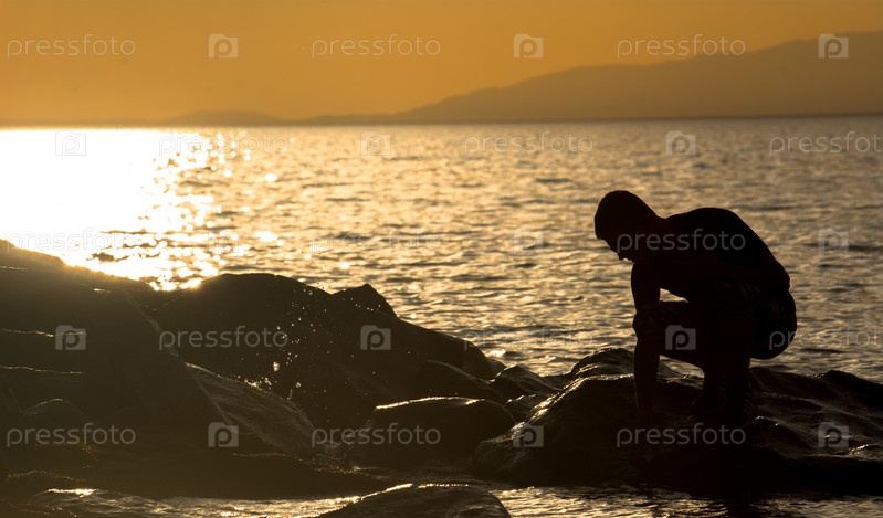 Силуэты парня, сидящего на берегу озера в лучах заката
