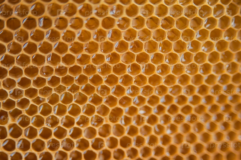 Рамка с пчелами и медом, сотовые ячейки крупным планом