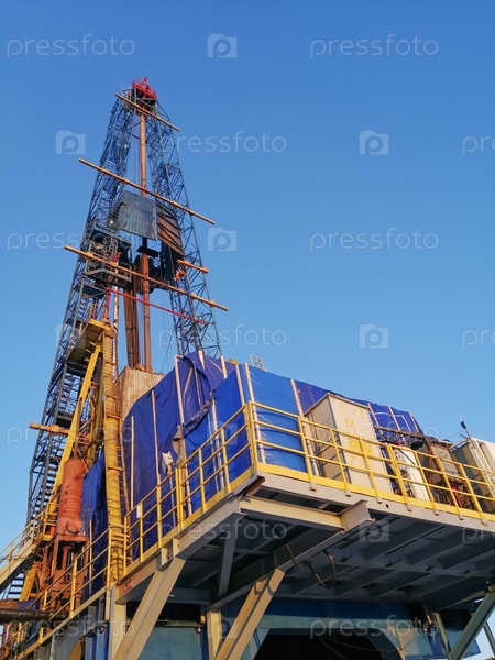Общий вид конструкции буровой установки для бурения нефтяных и газовых скважин. Нефтяная вышка, оборудование и коммуникации. Бурильные трубы стоят вертикально