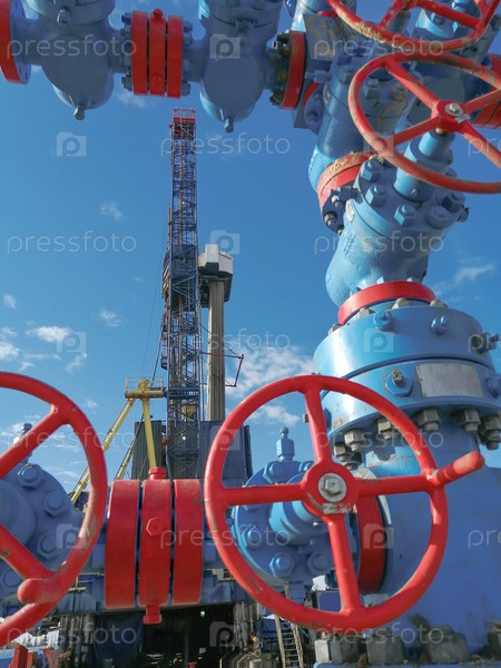 Фонтанная арматура газовой скважины с маховиками задвижек высокого давления. На заднем плане буровая установка. Некоторые детали композиции размыты. Летний день, голубое небо