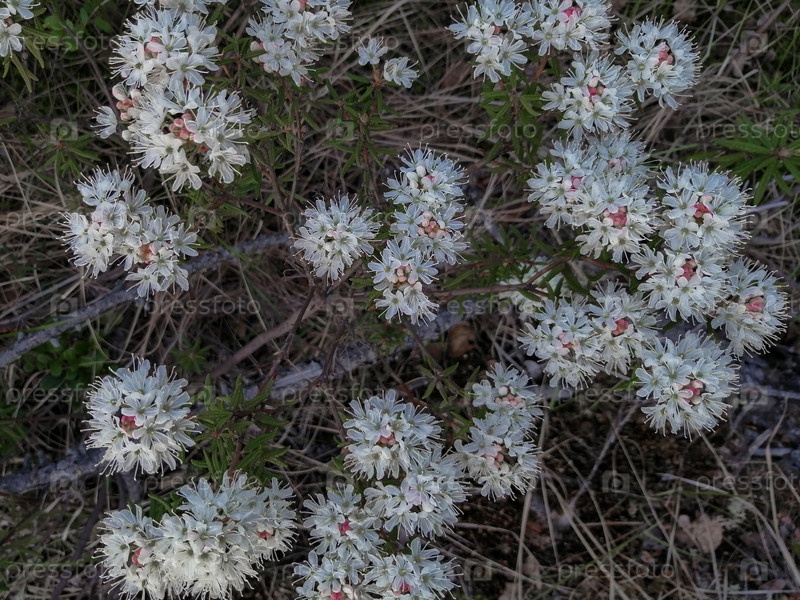 Маленькие белые соцветия кустарника багульника из семейства вересковых рода рододендронов, растущего в северной тундре. Летняя природа тундры. Уникальная полярная флора