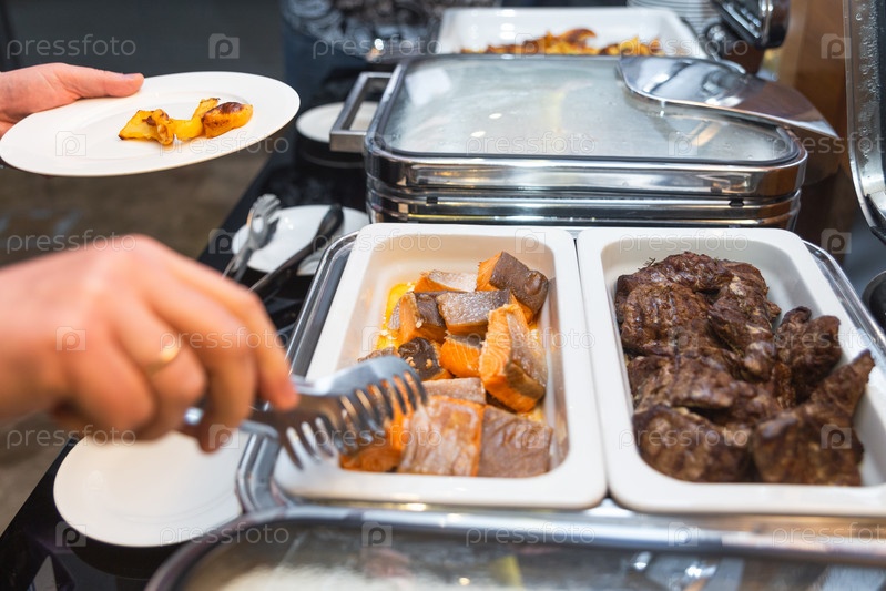 Участники бизнес-семинара выбирают еду во время обеденного перерыва в ресторане самообслуживания-шведского стола