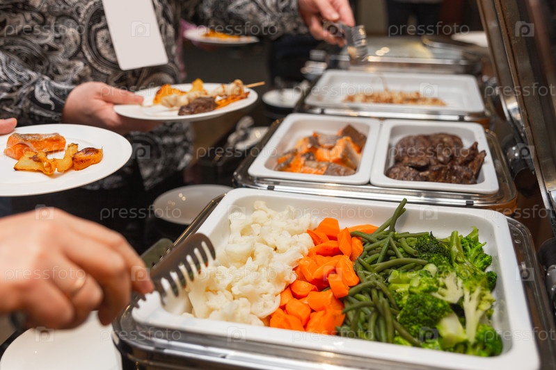 Участники бизнес-семинара выбирают еду во время обеденного перерыва в ресторане самообслуживания-шведского стола