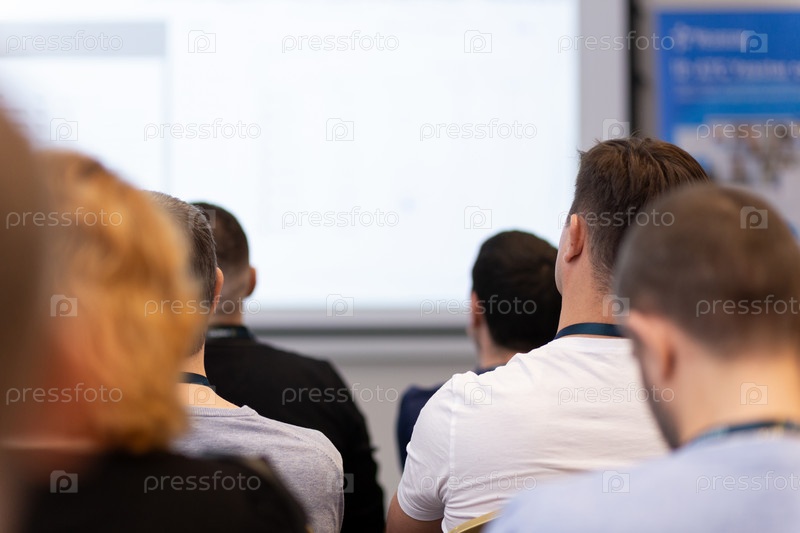 Вид сзади на аудиторию на бизнес-конференции или семинаре. Аудитория слушает лектора на конференции в аудитории