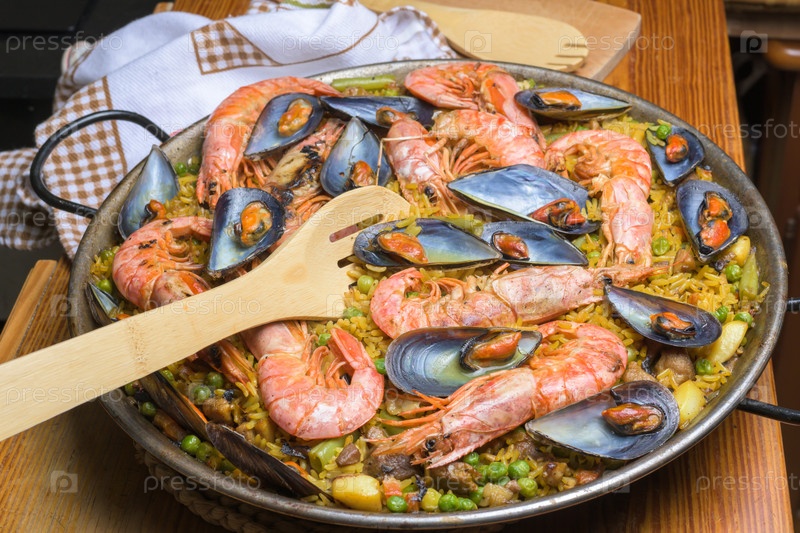 Крупный план паэльи из креветок и мидий на сковороде с деревянной лопаткой, типичная испанская кухня, Майорка, Балеарские острова, Испания,