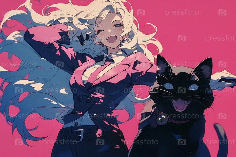Аниме кот и девушка на розовом фоне поют и танцуют
