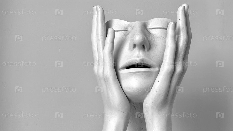 Гипсовая фигурка без макушки с открытым ртом на сером фоне с копировальным пространством