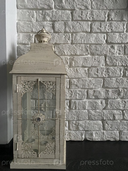 У стены, обложенной кирпичом, стоит старинная лампа. Вид сбоку, цвет белый