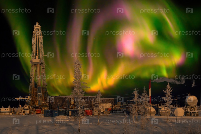 Зимний пейзаж полярной ночью с буровой установкой. Северное нефтегазовое месторождение. На заднем плане красивое небо с северным сиянием