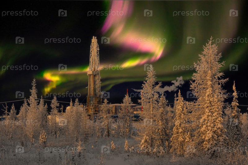 Зимний пейзаж полярной ночью с буровой установкой. Северное нефтегазовое месторождение. На заднем плане красивое небо с северным сиянием