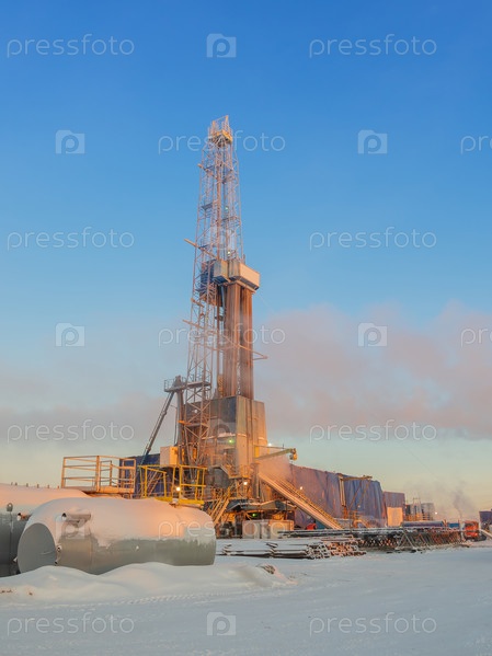 Вид на буровую установку для бурения нефтяных и газовых скважин в лучах восходящего солнца. Зимний полярный день в Арктике. Солнце окрашивает все в оранжевый цвет