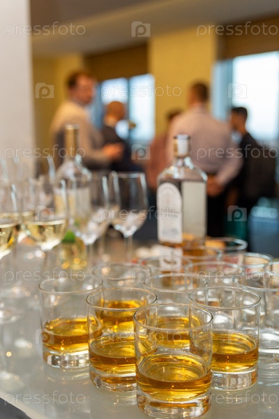 На стойке стоит множество стаканов со скотчем, бренди и вином