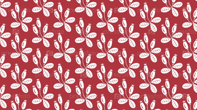 Прямоугольный красный фон с повторяющимся узором из плодов и листьев шиповника