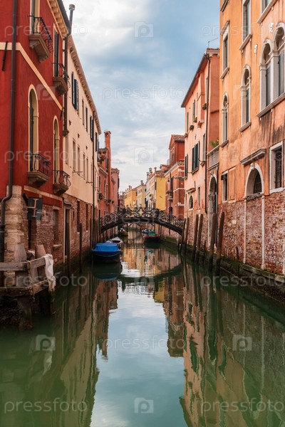 Вид на тихую улицу со старым мостом и узким каналом с лодками вдоль берега. Жилой район Венеции, Италия