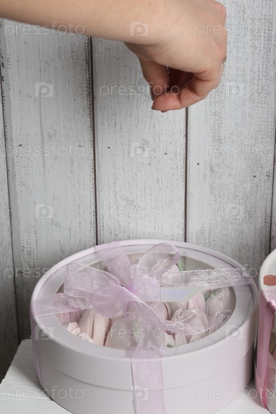 Зефир в коробке. Зефирные тюльпаны. Коробочка розовая, перевязана ленточкой. Крупный план. Вид сверху