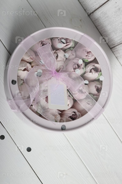Зефир в коробке. Зефирные тюльпаны. Коробочка розовая, перевязана ленточкой. Крупный план. Вид сверху