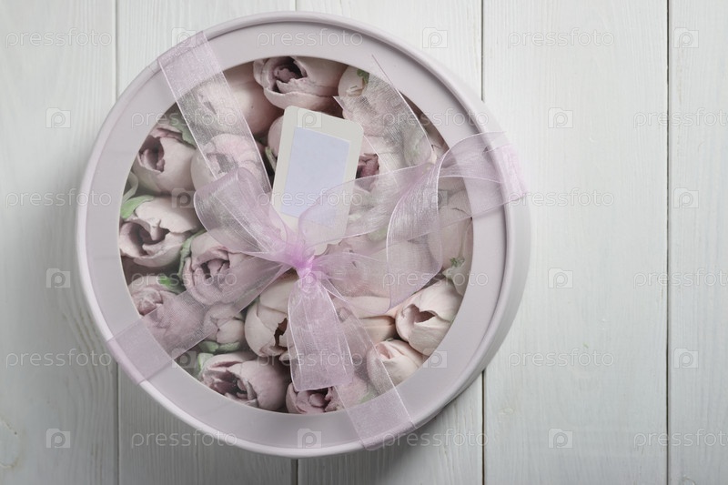 Зефир в коробке. Зефирные тюльпаны. Коробочка розовая, перевязана ленточкой. Он стоит на белом столе. Снято сверху