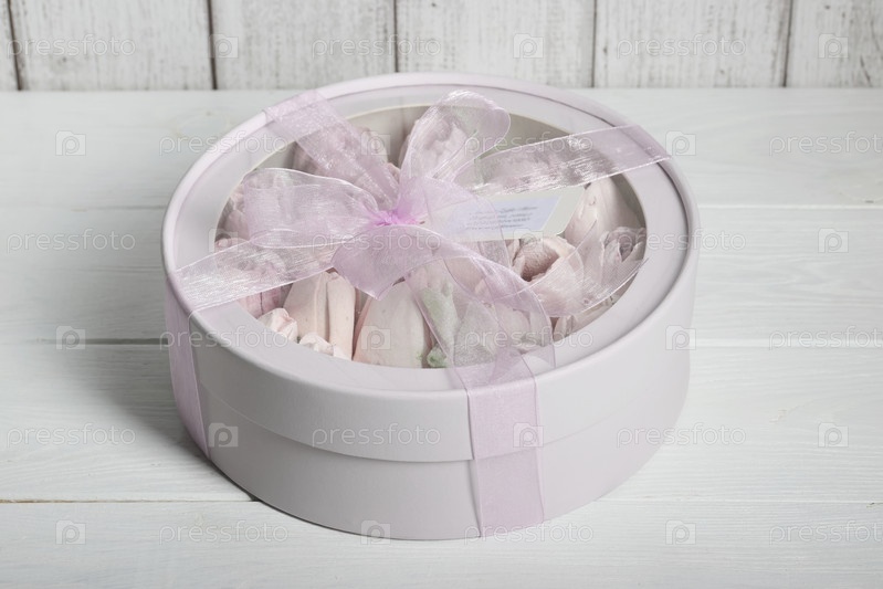 Зефир в коробке. Зефирные тюльпаны. Коробочка розовая, перевязана ленточкой. Крупный план