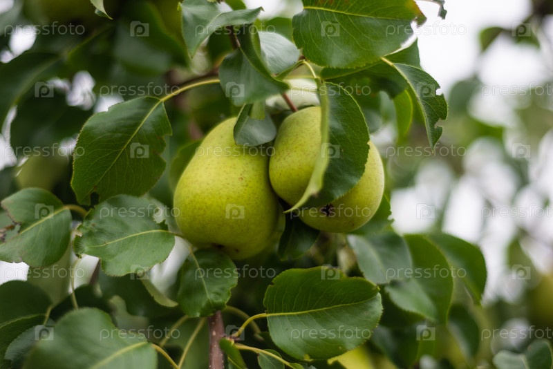 На садовом участке созревают крупные спелые сортовые груши. Фрукты. Крупные спелы сортовые груши созрели на садовом участке. Сбор урожая. Фрукты