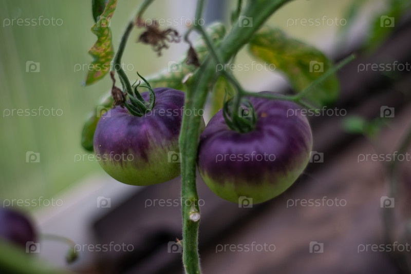 Большие необычные сорта фиолетовых помидоров созревают на ветке в теплице. овощи. выращивание овощей. большие необычные сортовые пурпурные помидоры созревают на ветви в теплице. овощи. выращивание овощей