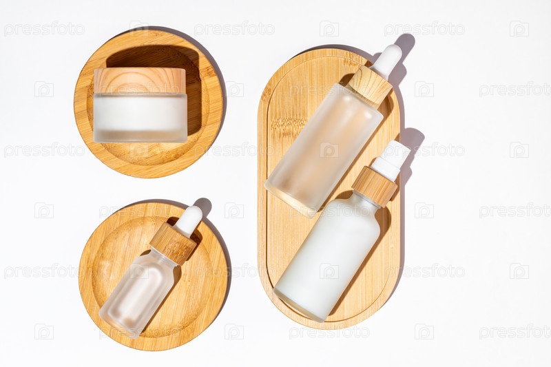 Макет косметических бутылочек для ухода за кожей на деревянных подносах. Баночка с кремом, шаблон стеклянной бутылки сыворотки, дозатор лосьона на белом фоне с тенями, вид сверху. Макет фирменной спа-упаковки. Фирменный стиль