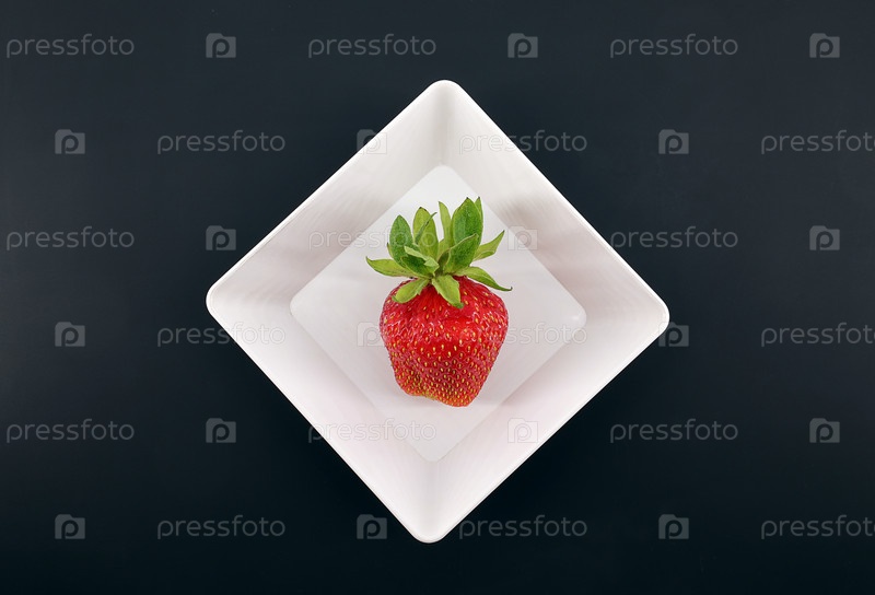 Клубничная ягода лежит в квадратной тарелке на черном фоне