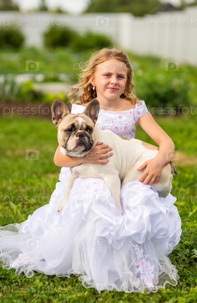 В жаркий летний день на улице красивая одетая девушка держит в руках французского бульдога. Девушка-модель и собака