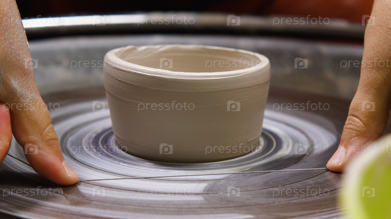 Женские пальцы с ниткой для вырезания глиняной заготовки с гончарного круга. Крупный план. Мастер работает в гончарной мастерской. Понятие ручной работы, искусства и ремесла