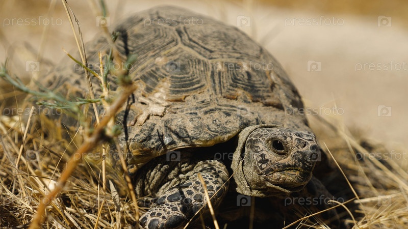 Крупный план большой наземной черепахи на сухой желтой траве. Лето, песок, солнечный день